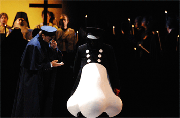 Alle sechzehn Szenen in zehn Bildern waren sehr unterschiedlich und mit einem großen Aufwand angelegt: es gab stattliche Maschinerie mit viel Technik, interessantem Licht sowie Schatten. Ausdrucksvolle Masken kennzeichneten die Protagonisten recht treffend und die prunkvollen Kostüme waren aus der Zeit des späten neunzehnten Jahrhunderts, so daß man sie stets als ästhetischen Gaumenkitzel genießen konnte. Die Handlung lief fließend und anschaulich ab. Es dominierten klare Farben im Bühnenbild, dessen Wände immer wieder auf verschiedenen Ebenen mit Räumen bestückt waren. Schon die Einleitung spielte sich in einer kleinen und weit oben angelegten Zelle des Barbiers ab. Das Frühstück Jakowlewitschs bot einen angenehmen Anblick mit einer zänkischen, jedoch kurzweilig dargestellten Frau am weißen Feuerofen. Das im Gesang und Aktivität umgesetzte russische Temperament trug zur köstlichen Unterhaltung bei. Große Schriftzüge in russischer Sprache kamen immer wieder im Bühnenbild zum Einsatz. Besondere Beachtung verdienen auch die vielen Nasenkostüme, akrobatischer Tanz und Choreografie, der ansehnliche Gartenzaun und das weiße Pferdchen, das von zwei Personen vorzüglich dargestellt wurde.