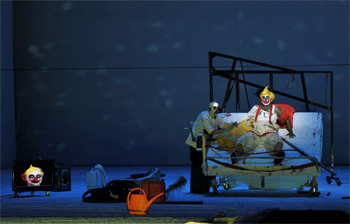 Der Clown Siegfried ist mit einem Teddy auf ein blutbeflecktes Krankenhausbett gefesselt, während Mime und Wotan als Götter in Weiß in der Wett-Szene die Weltpolitik der Ring-Tetralogie erfragen. Im weiteren bekommt der Zuschauer die Möglichkeit, auf einem Fernsehbildschirm Billig-Pornos zu schauen, während Mime mit der Antwort ringt, wer denn nun Nothung neu schmieden könne. Alberich erscheint in der Gestalt Adolf Hitlers. Die Maskierung hat einen leichten Hang zur Komik, in der gestischen Umsetzung wirkt diese Personifizierung allerdings eher monumental. Der Kampf Siegfrieds mit Fafner spielt sich auf einer Meta-Ebene als Marionettentheater ab. Ein hüpfender Drache und ein tänzelnder Siegfried en miniature entscheiden hier über das weitere Schicksal von Göttern und Menschen. In der Haupthandlung bleiben ein zweigeteilter Torso Fafners und ein enthaupteter Mime zurück, indes Siegfried Purzelbäume und Räder schlagend dem Waldvogel folgt. Die statuenhafte Erda erinnert in ihrem Strahlenkranz ikonographisch an das Apokalyptische Weib. Ebenso symbolschwanger ist eine leuchtende Hand, die den Ring skizziert, als Tarnhelm hat man einen übergroßen schwarzen Zylinder gewählt; beides liegt vergessen am Bühnenrand. In einem überdimensionalen weißen Kleid schwebt in der Schlußszene Brünnhilde im offenen Bühnenraum, während Siegfried vergebens versucht, sich mit einer Leiter anzunähern.