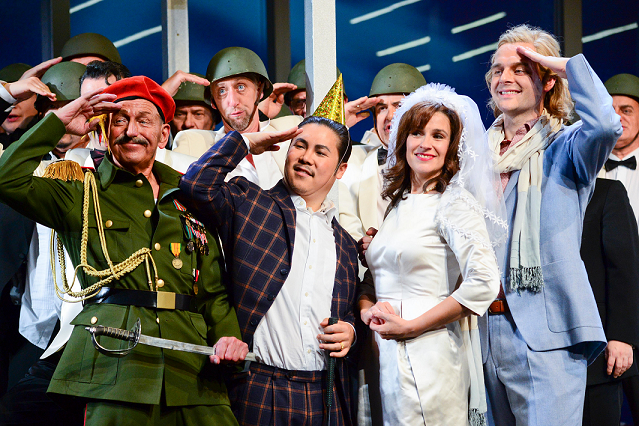 Das Bild zeigt: Dieter Hönig (General Bumm), Hansung Yoo (Baron Puck), Stefanie Schaefer (Großherzogin von Gerolstein), Daniel Jenz (Prinz Paul), dahinter Herren des Opernchores