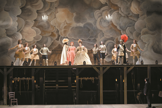 Die „Begrüßung“ des Hofstaats mit Alcina und Ruggiero in reichen Barockkostümen ereignet sich auf der oberen Ebene, danach steigen sie auf die untere Ebene herab.